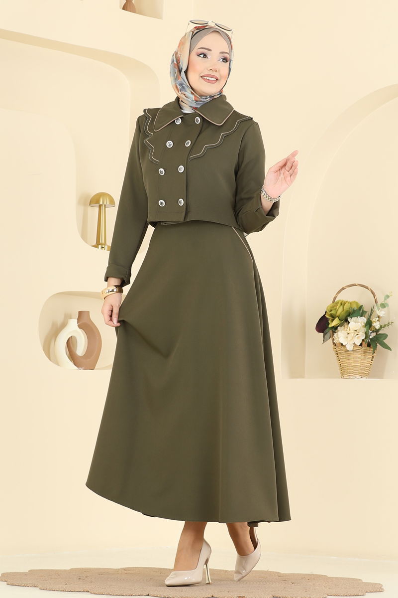 Shirt Collar Double Set offers a unique hijab combination suitable for all seasons. Washable at 30 degrees with gentle care, this set ensures your elegance in daily use. Featuring a shirt collar and front button design, it offers practical use while its unlined structure promises a light and comfortable experience. The skirt on the model enhances the appearance and offers ease of use with a zipper at the waist, while the pocket detail increases functionality. This combination, with its modern and stylish design, will become an indispensable part of your wardrobe. The product is displayed in size 38.