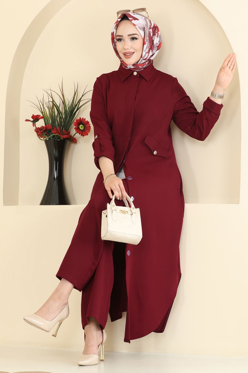 The Accessory Pocket Dabıl Suit KOMBIN is a hijab outfit suitable for all seasons. It can be washed at 30 degrees with delicate care. Made from durable and stylish Dabıl fabric, this suit features a shirt collar design and is unlined, with the displayed model wearing size 40. It offers practical use with its front usable buttons and hidden buttons. The waist of the outfit is stitched, and the pants have an elastic waistband, ensuring comfortable wear. The pocket detail on the tunic and pants enhances your elegance, while the active buttons on the cuffs add a finishing touch.