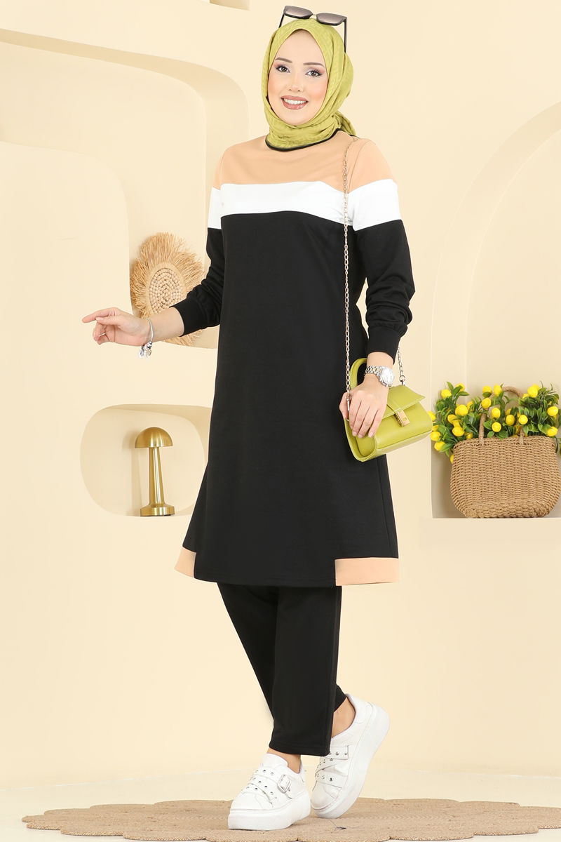 Our Garni Detailed Two Thread Suit, model hijab product, can be comfortably used in all seasons. Offering comfort with a crew neck and an elastic waistband on the pants, this unlined product should be washed gently at 30 degrees. The tunic and pants style is ideal for those seeking both elegance and comfort. (The product worn by the model is size 38.)
