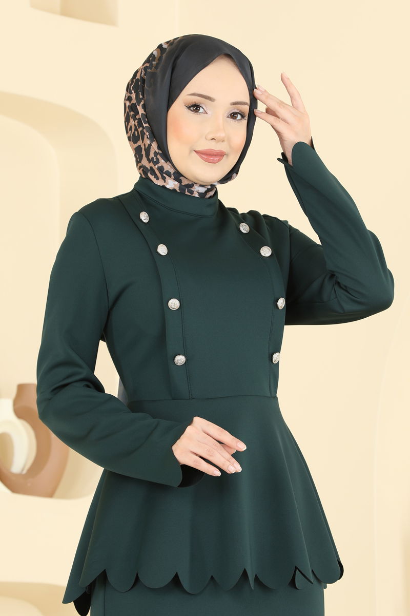 Elevate your style with the Gold Buttoned Scuba Suit! Ideal for all-season wear, this hijab suit combines the soft and stretchy fabric of scuba material with day-long comfort. It features an elegant semi-standing collar and a convenient concealed zipper at the back. The stitched waist design on the tunic and an elastic waist on the skirt ensure a contemporary look, while the decorative buttons add a sophisticated touch. It's washable at 30 degrees on a gentle cycle, ensuring durability. A must-have in every fashion-conscious woman's wardrobe, this suit is perfect for both everyday wear and special occasions!