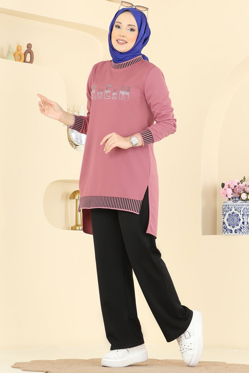 Product Feature : It is a new season hijab fashion product. The product has a Cycling collar. The tunic has a side slash.. Unlined. Stones are Printed. The waist of the trousers is elastic. There may be a tonal difference in the product due to concept photo shoots.