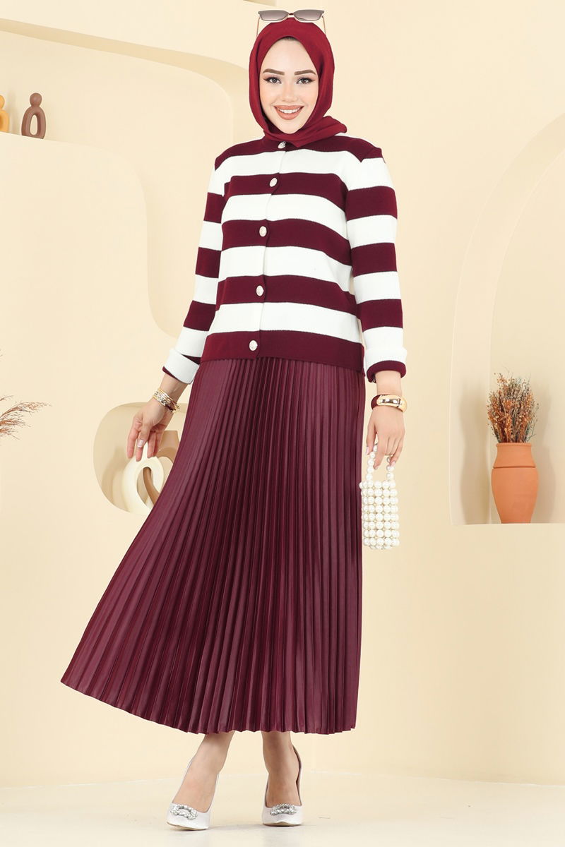 The Striped Detail Cardigan Set stands out with its modern and elegant design. Ideal for autumn and winter, this hijab suit combines comfort and elegance with a mix of knitted and satin fabrics. It can be washed gently at 30 degrees. The crew neck and front buttons make it convenient to wear. The elastic waist of the skirt offers comfort throughout the day. The product is unlined and available in size S-M on the model. Cardigan is standard.
