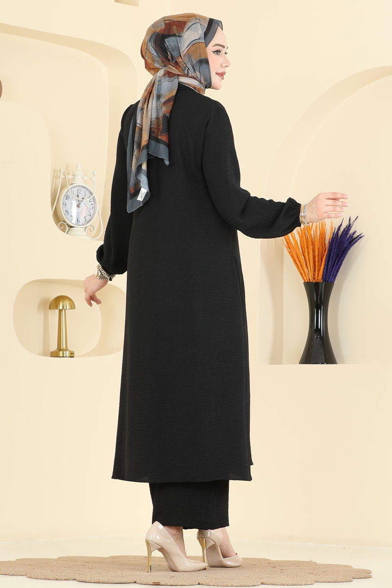 The Buttoned-Front Duo Set, with its KOMBIN model, brings together modern design and comfort. Suitable for all seasons, this modest wear is made from Aerobin fabric and is distinguished by its lightweight structure. The set enhances elegance with its shirt collar and front button details, while the side-slit tunic adds a unique touch. The pants have an elasticated waist with pockets, and elasticated cuffs. It can be washed delicately at 30 degrees Celsius. This KOMBIN duo set ensures you look chic and stay comfortable in any setting.