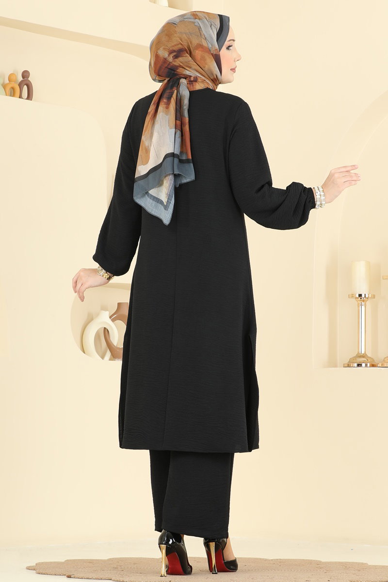Designed to showcase your style across all seasons, the Elegant Side-Slit Suit combines the comfort and elegance of aerobin fabric. With its delicate nature, it is easy to maintain with its washable at 30 degrees feature. The bicycle neckline and front-button design provide a modern look. The side slits on the tunic and the elastic waistband on the pants ensure comfort all day long. Suitable for both everyday and special occasions, this suit stands out with its elegant details.