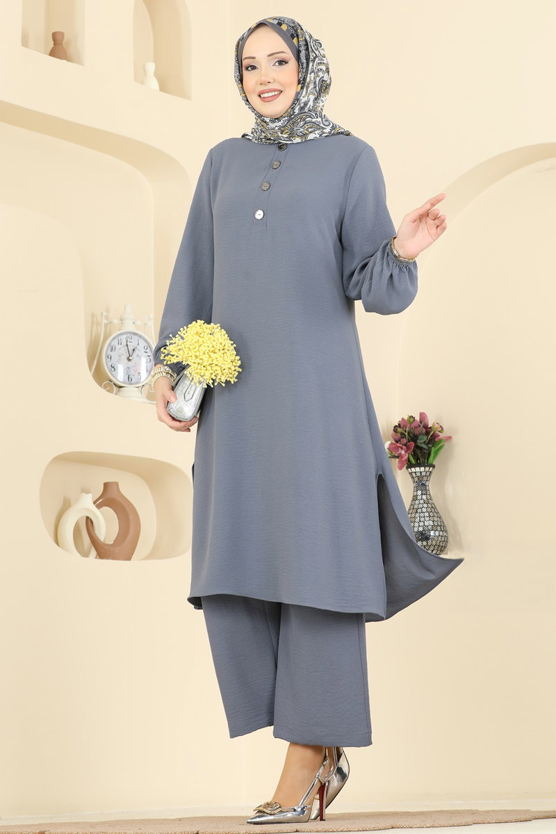 Designed to showcase your style across all seasons, the Elegant Side-Slit Suit combines the comfort and elegance of aerobin fabric. With its delicate nature, it is easy to maintain with its washable at 30 degrees feature. The bicycle neckline and front-button design provide a modern look. The side slits on the tunic and the elastic waistband on the pants ensure comfort all day long. Suitable for both everyday and special occasions, this suit stands out with its elegant details.