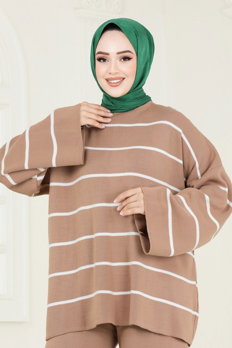 Striped Detail Knitwear Set model is a modest fashion product. It can be used in Autumn and Winter seasons. Should be washed at 30 degrees without spinning. Knitwear fabric. The product has a Mandarin collar and is lined. (The product on the model is standard size.) The inner dress is worn from the head. The pants have an elastic waistband.