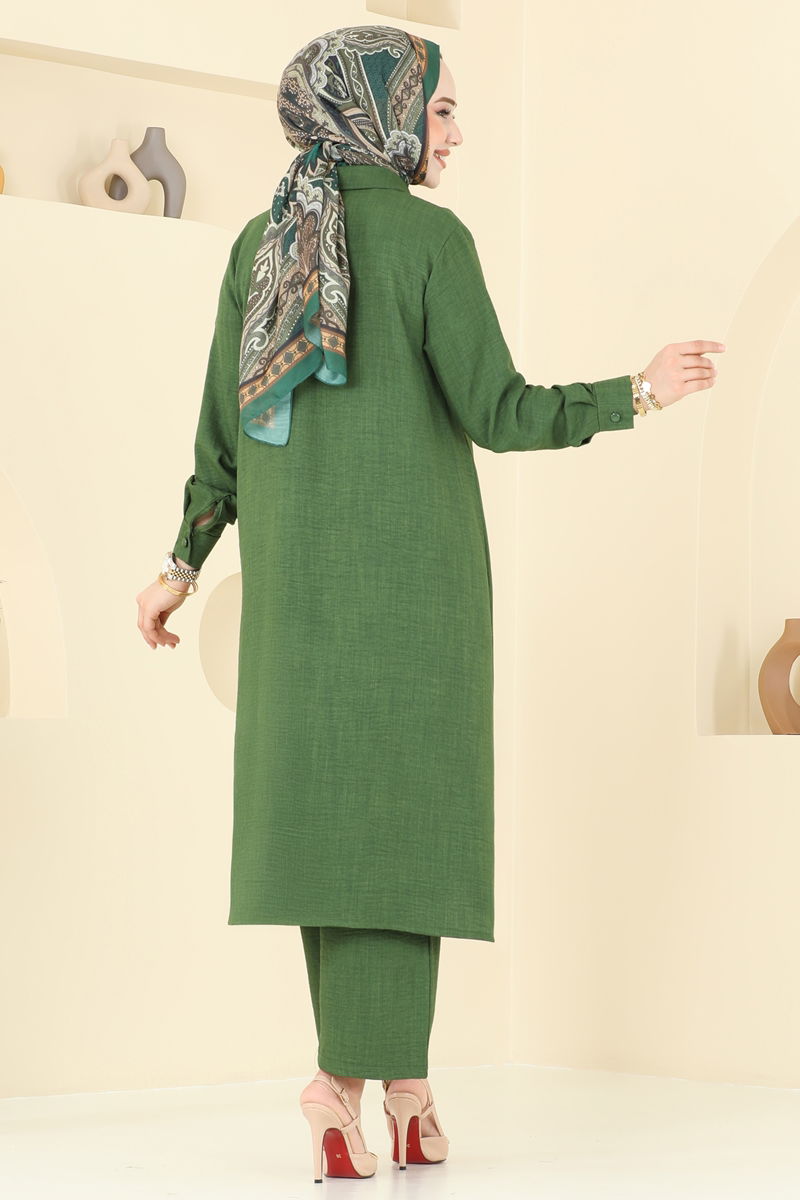 Product Feature : It is a new season hijab fashion product. The product has a Shirt collar. The product has From the front buttons. The tunic has a side slash.. Unlined. The stones are glued. Blouse is not included. Sample combination is made with the blouse to show the intended use of the product. Pocket available. The waist of the trousers is elastic. Cuff buttons are active. There may be a tonal difference in the product due to concept photo shoots.
