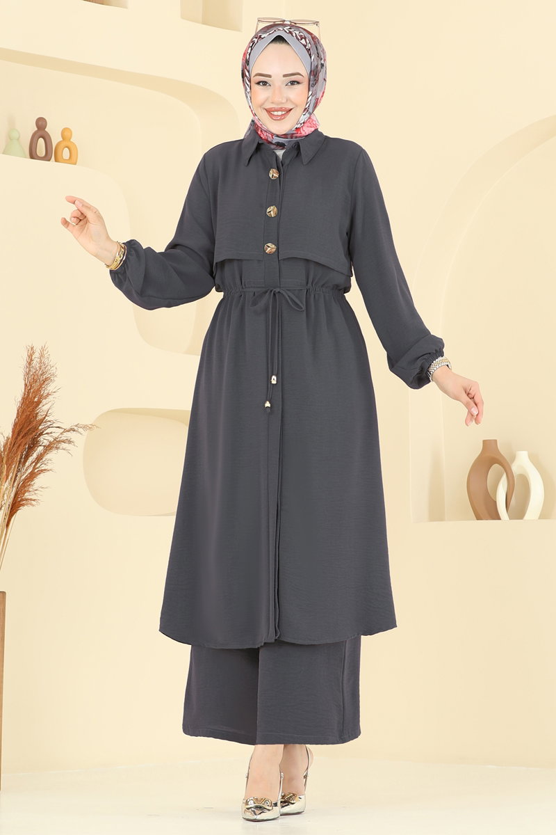 The Elena Buttoned Modest Suit is a versatile ensemble you can confidently wear in any season. Made from aerobin fabric, it offers a gentle touch and features a chic, modern design with hidden buttons and an unlined style. The set includes both a tunic and pants, with the pants featuring an elastic waistband and cuffs for additional comfort. The blouse is not included. Easily maintainable, it can be washed at 30 degrees on a gentle cycle. The displayed size 38 suite stands out with its ideal measurements, stylish shirt collar, and decorative button details.