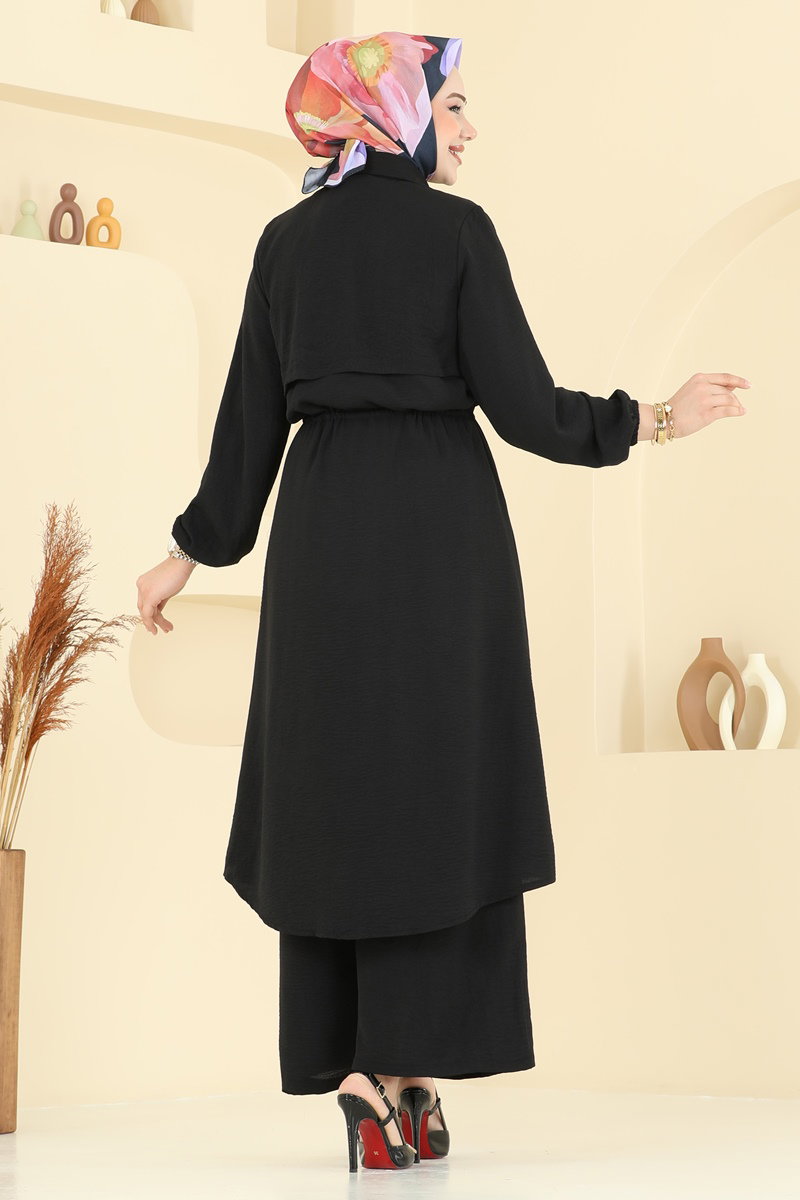 The Elena Buttoned Modest Suit is a versatile ensemble you can confidently wear in any season. Made from aerobin fabric, it offers a gentle touch and features a chic, modern design with hidden buttons and an unlined style. The set includes both a tunic and pants, with the pants featuring an elastic waistband and cuffs for additional comfort. The blouse is not included. Easily maintainable, it can be washed at 30 degrees on a gentle cycle. The displayed size 38 suite stands out with its ideal measurements, stylish shirt collar, and decorative button details.