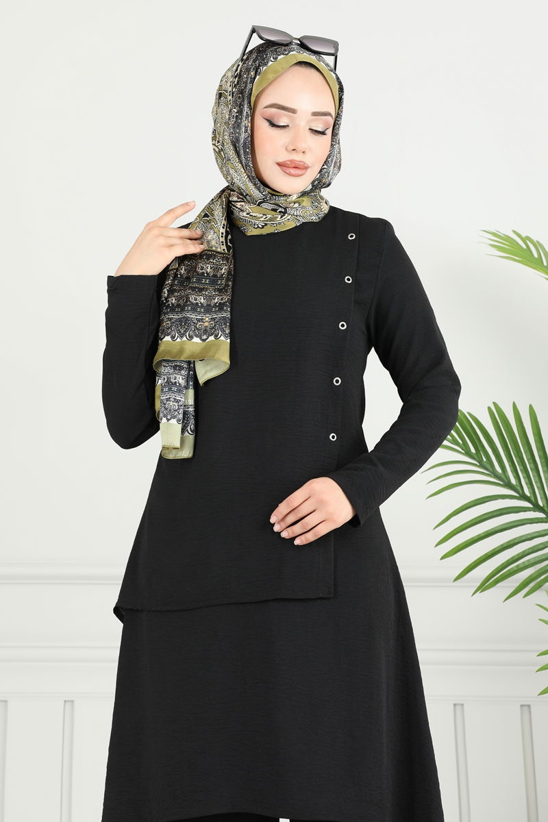 Stylish and functional, the Asymmetric Cut Aerobin Set brings a fresh perspective to modest fashion. Suitable for all seasons, this outfit offers all-day comfort thanks to its special aerobin fabric. The bicycle neck and lining-free design lend a contemporary look, while the ensemble is easily maintained with gentle washing. Comprising a tunic and trousers, the elastic waistband of the pants ensures a perfect fit. Featuring a practical button at the back and printed studded details, this set will complete your elegant style.