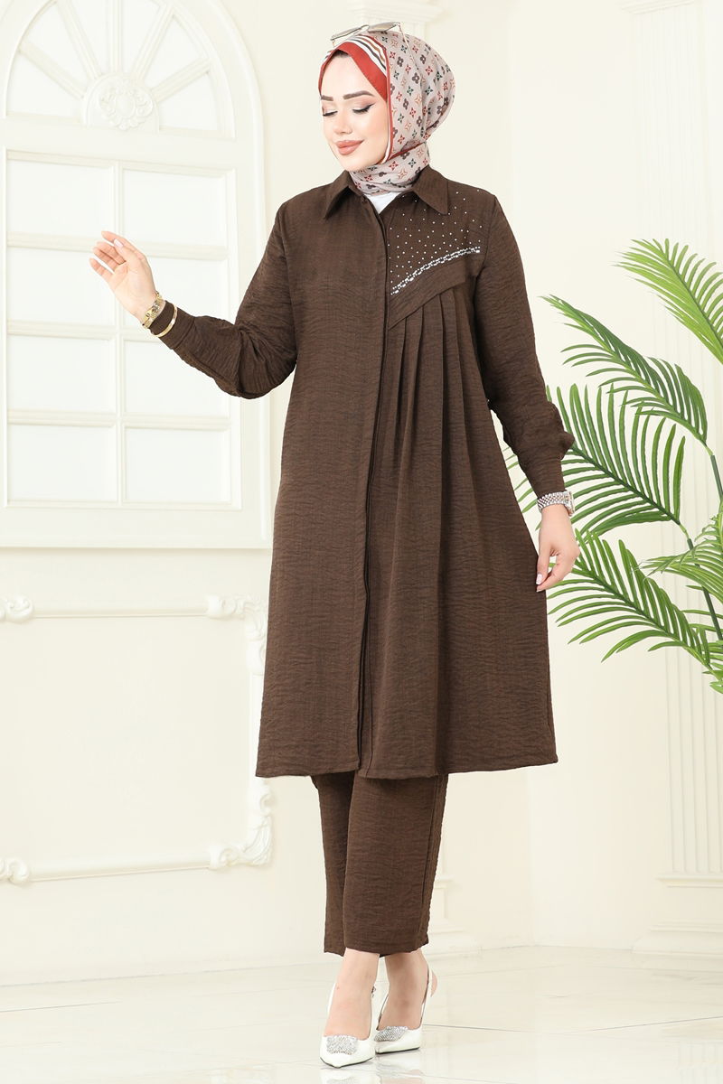المنتج لديه ياقة القميص. المنتج به أزرار جيزلي. غير مبطنة. يتم لصق الحجارة. خصر البنطال مرن. أزرار الكفة نشطة. قد يكون هناك اختلاف في الدرجة اللونية في المنتج بسبب التقاط الصور الفوتوغرافية.