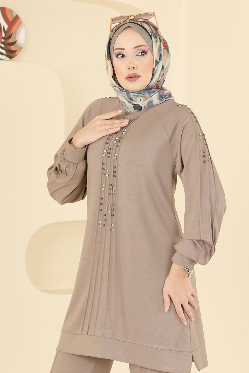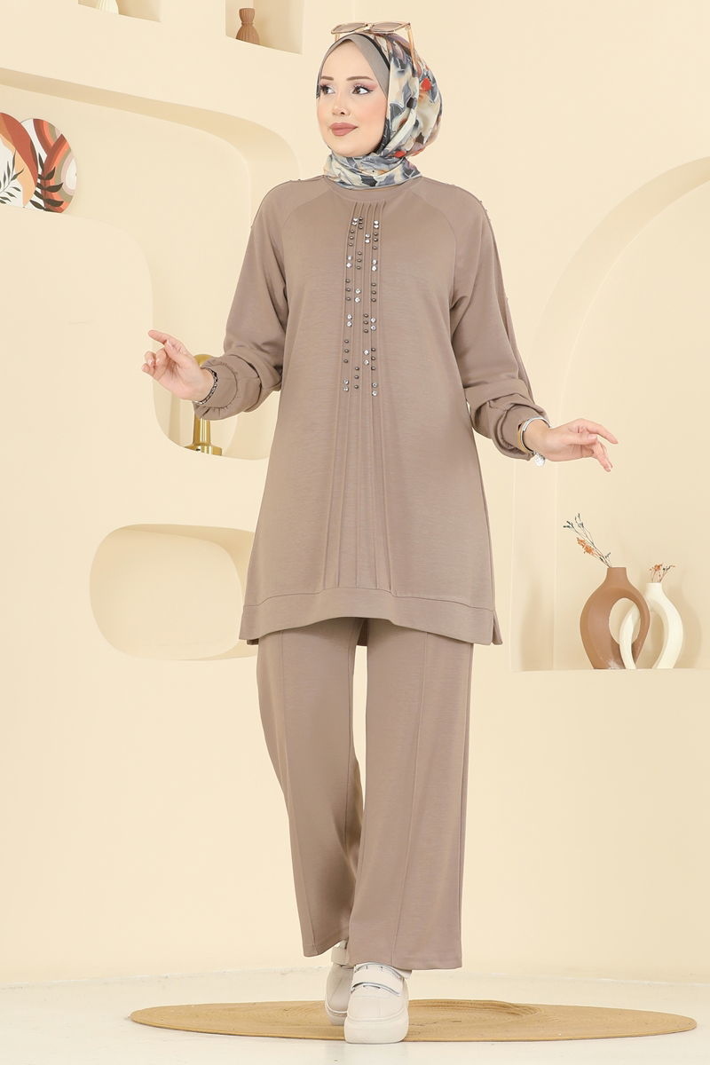 The Stone Detailed Modal Suit offers elegance and comfort together, providing a sophisticated option for modest wear. Suitable for all seasons, this suit dazzles with its striking stone details. Enjoy the soft touch of modal fabric with the design that facilitates easy washing and ironing. Consisting of a tunic and trousers, this set offers all-day comfort thanks to its elastic waist. It features a crew neck and is unlined for a contemporary look. The product is displayed in size S on the model.