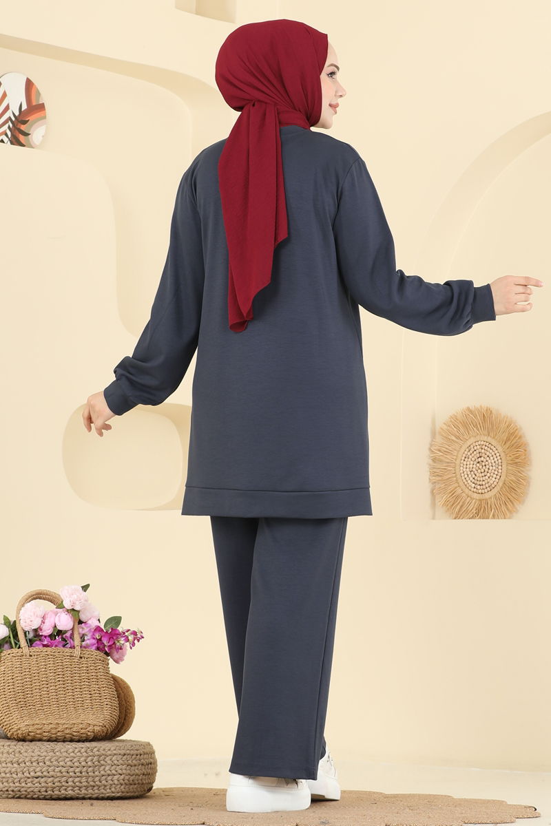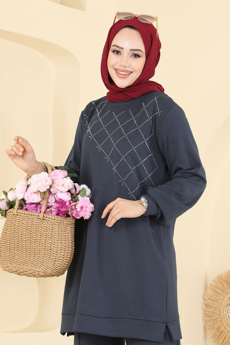 The Nervür Detailed Modal Set is specially designed for ladies preferring modest wear and can be comfortably worn in all seasons. Made from modal fabric, this outfit can be washed at 30 degrees with gentle care. It features a crew neck and is unlined for comfort, while the elastic waistband on the trousers ensures a comfortable fit. The tunic is adorned with elegant stone details, offering both style and comfort. The product model wears size 38.
