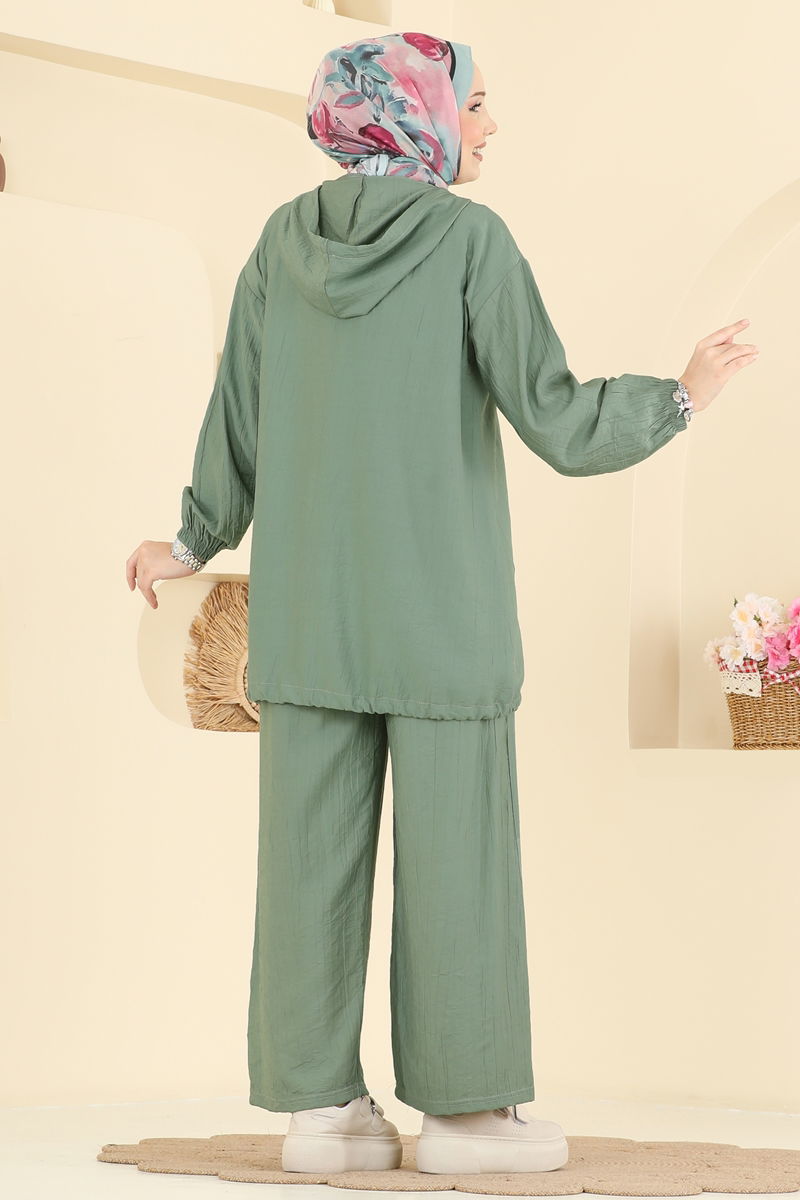 Product Feature : It is a new season hijab fashion product. The neck drawstring is active. The product has a Hooded collar. Unlined. The product has a zipper at the From the front part. Stone details are pebble. The hood is sewn to the product. Pocket available. The waist of the trousers is elastic. There may be a tonal difference in the product due to concept photo shoots.