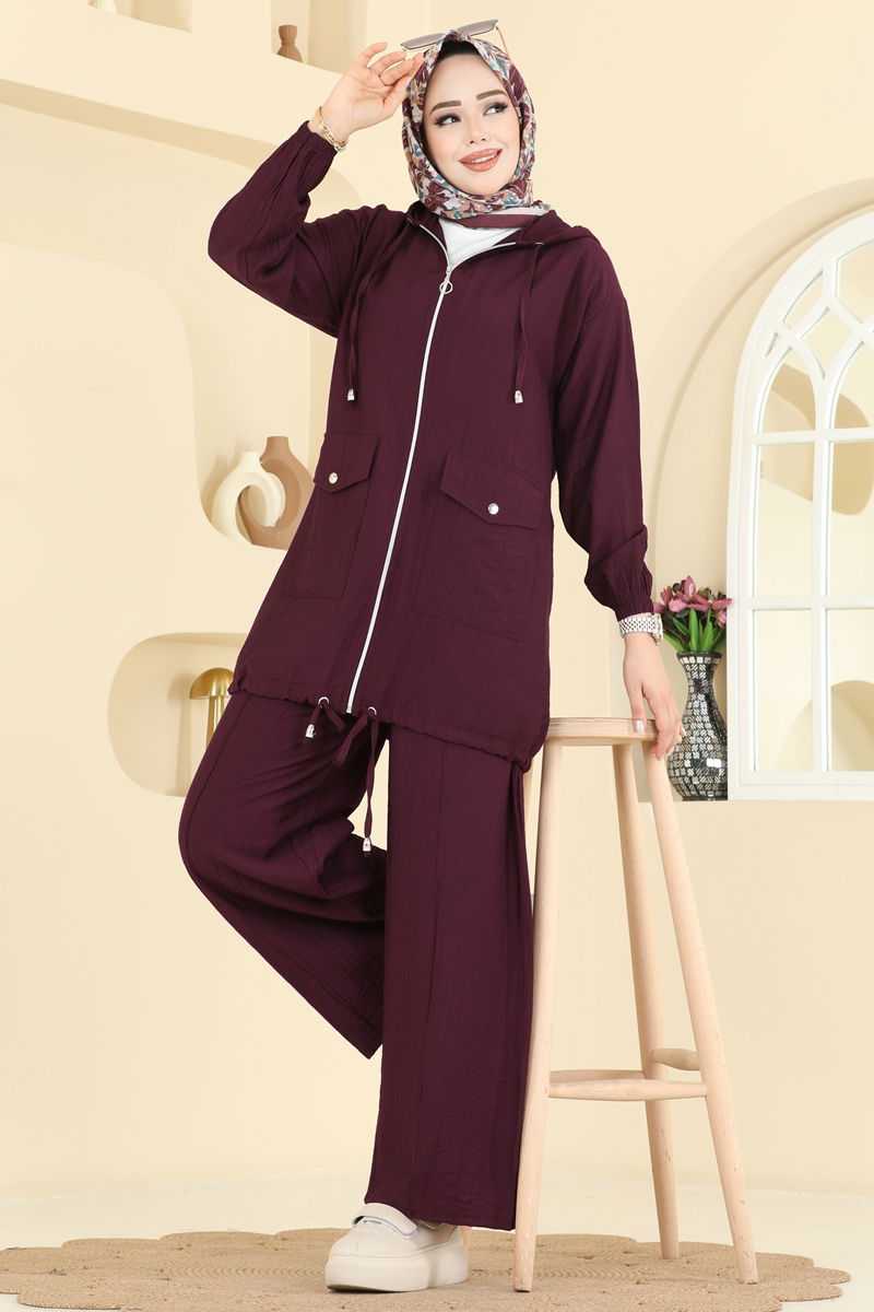 Product Feature : It is a new season hijab fashion product. The neck drawstring is active. The product has a Hooded collar. Unlined. The product has a zipper at the From the front part. There are adjustable laces on the right and left hem of the product. The hood is sewn to the product. Pocket available. The waist of the trousers is elastic. The cuff is rubberized. There may be a tonal difference in the product due to concept photo shoots.