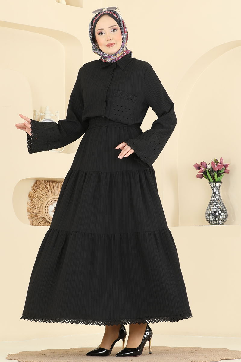المنتج لديه ياقة القميص. المنتج به أزرار من الأمام. غير مبطنة. التفاصيل المخرمة مخيطة. الجيب الصدري نشط. .خصر التنورة مرن قد يكون هناك اختلاف في الدرجة اللونية في المنتج بسبب التقاط الصور الفوتوغرافية.