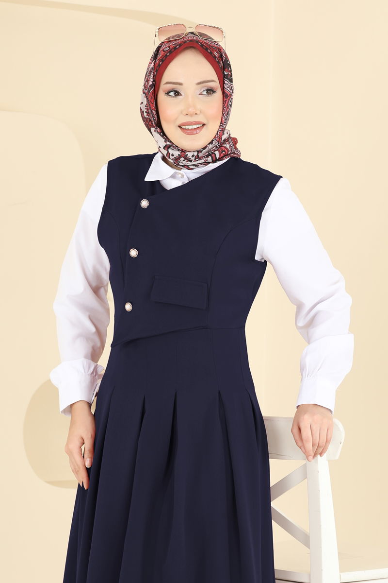The Pearl Buttoned Vest Suit, crafted from Dabıl fabric, is an elegantly styled modest wear ideal for special occasions. Featuring a shirt collar and half-button front design for practicality, it is unlined for comfort with active buttons on the cuffs. This suit, adorned with a vest and shirt details, further captivates with its pocket accessory. Suitable for use across all seasons.