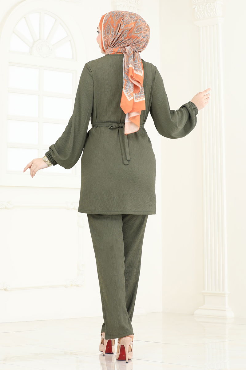 المنتج لديه ياقة دائرية. غير مبطنة. الحزام متضمن، ،يمكن استخدامها حسب الرغبة يتم خياطة السلسلة على المنتج. خصر البنطال مرن. السوار مطاطي. قد يكون هناك اختلاف في الدرجة اللونية في المنتج بسبب التقاط الصور الفوتوغرافية.