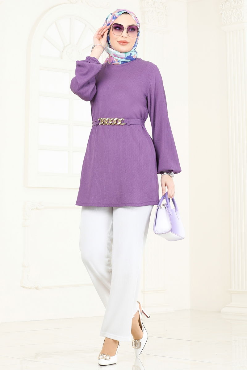 المنتج لديه ياقة دائرية. غير مبطنة. الحزام متضمن، ،يمكن استخدامها حسب الرغبة يتم خياطة السلسلة على المنتج. خصر البنطال مرن. السوار مطاطي. قد يكون هناك اختلاف في الدرجة اللونية في المنتج بسبب التقاط الصور الفوتوغرافية.