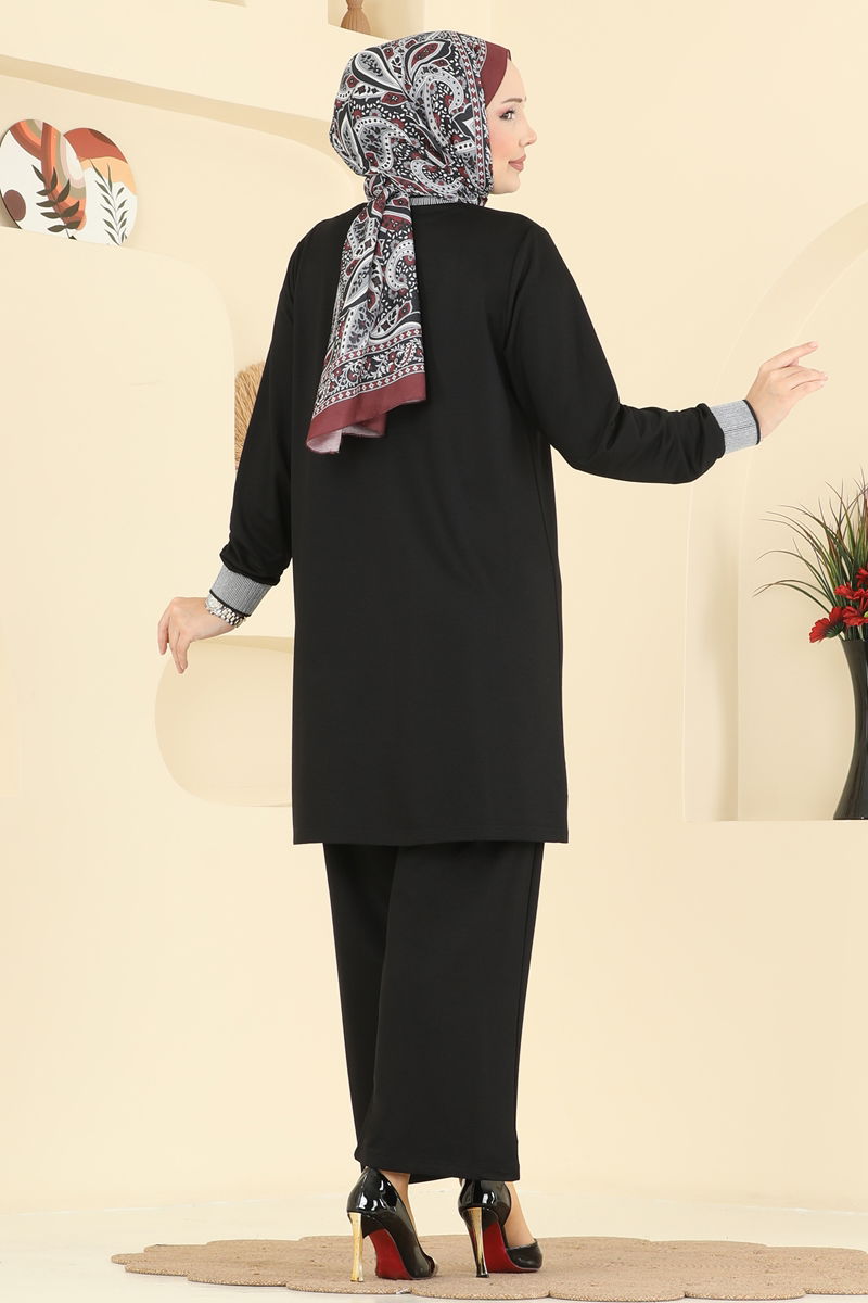 The Ribbed Detail Duo Set is designed to add elegance to your modest fashion style, suitable for all-season use. Made from soft and shiny crystal fabric, this set is a rare combination of comfort and style. Its crewneck design and lining-free structure offer coziness. The gems on the garment are fixed with adhesive, ensuring they stay intact even with prolonged use. The pants have an elastic waistband for all-day comfort. This set takes your modest fashion to the forefront, from everyday use to special occasions.