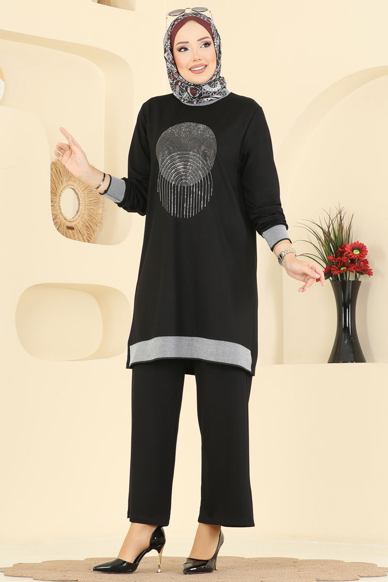 المنتج لديه ياقة دائرية. غير مبطنة. يتم لصق الحجارة. خصر البنطال مرن. قد يكون هناك اختلاف في الدرجة اللونية في المنتج بسبب التقاط الصور الفوتوغرافية.(المنتج على الموديل مقاس 38-40).