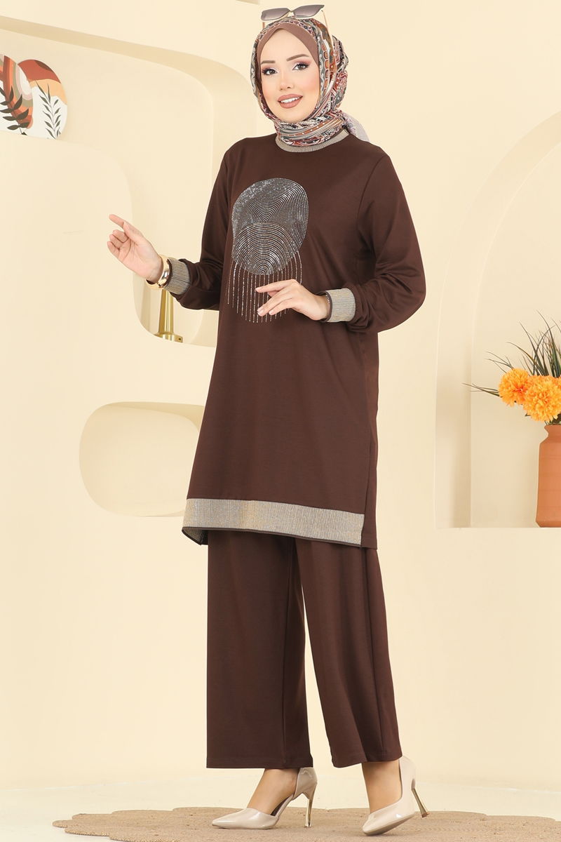 The Ribbed Detail Duo Set is designed to add elegance to your modest fashion style, suitable for all-season use. Made from soft and shiny crystal fabric, this set is a rare combination of comfort and style. Its crewneck design and lining-free structure offer coziness. The gems on the garment are fixed with adhesive, ensuring they stay intact even with prolonged use. The pants have an elastic waistband for all-day comfort. This set takes your modest fashion to the forefront, from everyday use to special occasions.