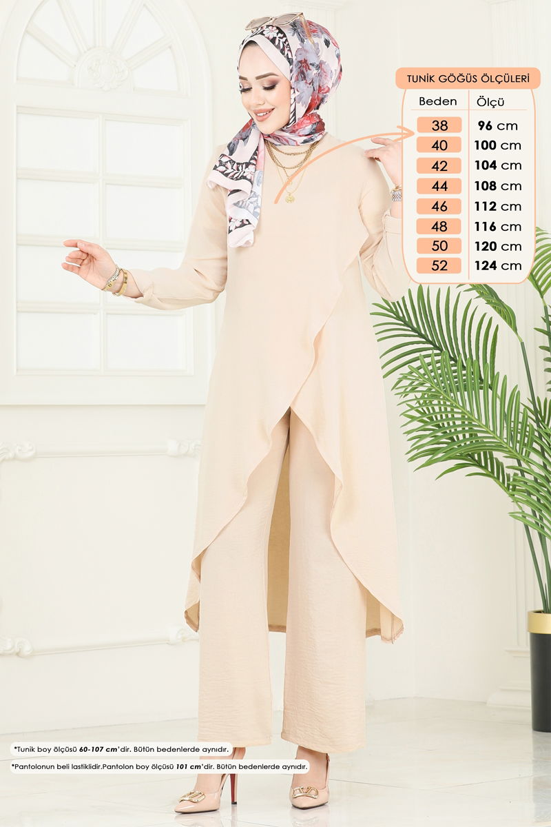 Featuring a modern and chic design, the Asymmetric Cut Aerobin Suit is a breath of fresh air in modest fashion. Suitable for all seasons, this item can be gently washed at 30 degrees. Made from Aerobin fabric, it offers both comfort and elegance with its bike neck and slit details. The unlined design, button detail at the back, and elastic waistband on the trousers ensure comfort all day long. (The product worn by the model is size 38.)