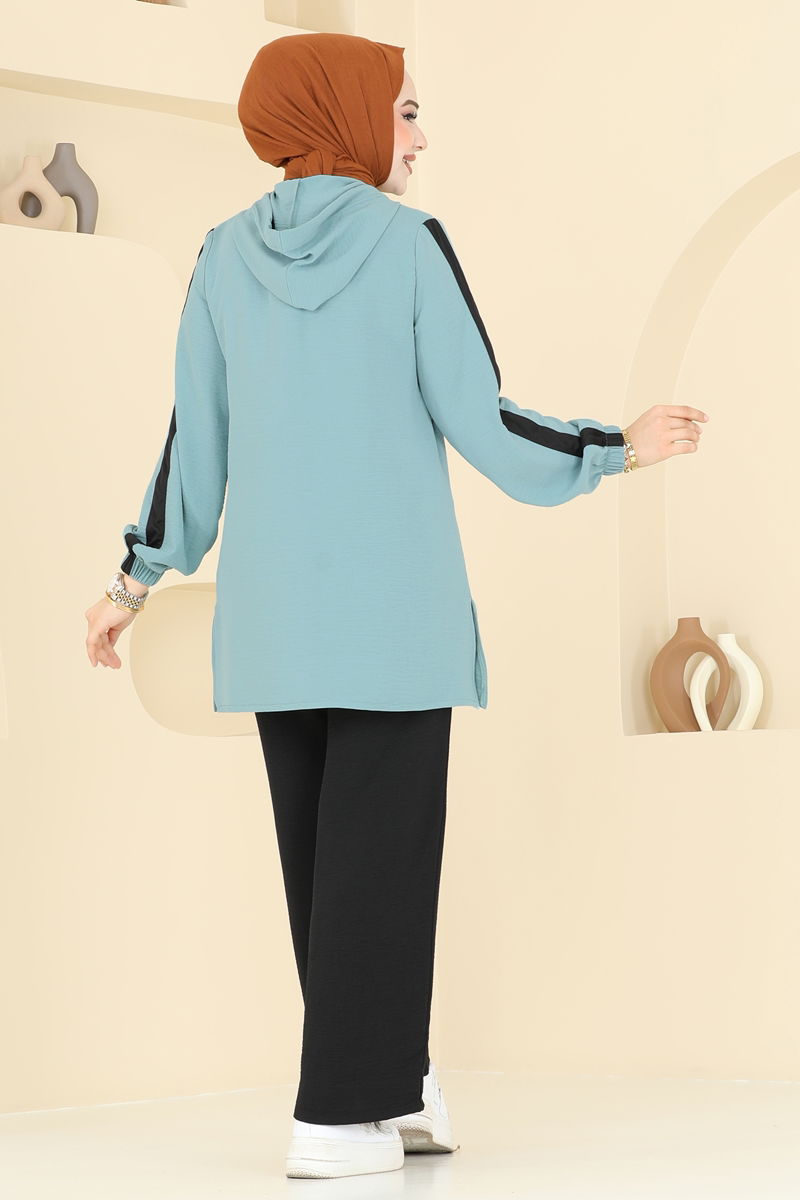 Product Feature : It is a new season hijab fashion product. It has a front zipper that can be used. The product has a Hooded collar. The tunic has a side slash.. Unlined. The coat of arms detail is sewn. The hood is sewn to the product. The waist of the trousers is elastic. The cuff is rubberized. There may be a tonal difference in the product due to concept photo shoots.