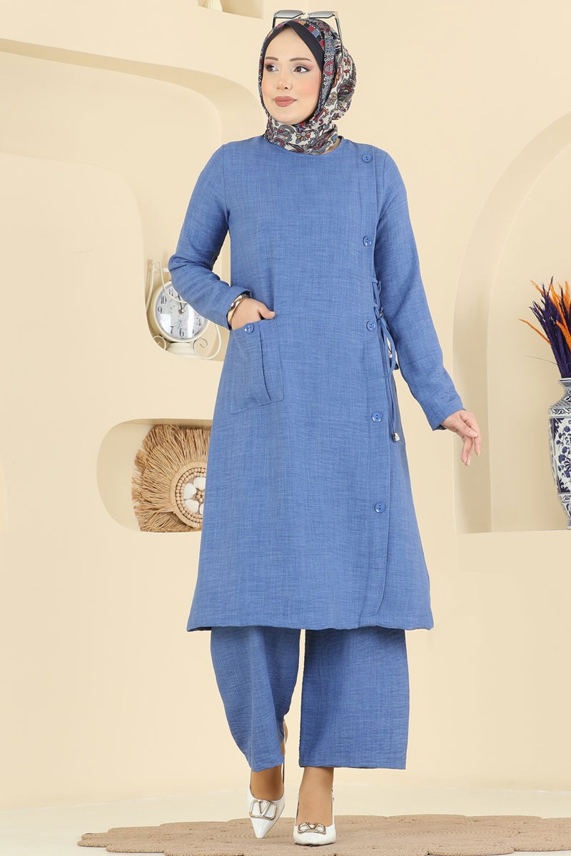 The Accessorized Buttoned Linen Suit COMBINE is a modest wear product that can be comfortably used in all seasons. Made from sofia linen fabric, this suit can be washed at 30 degrees on a gentle cycle. With a bike neck and unlined design, it adds a modern flair, while the accessorized buttons complete the elegance. The drawstring detail provides flexibility to the product; the drawstring can be used optionally. The pants have an elastic waist and the tunic features pocket details for functionality.
