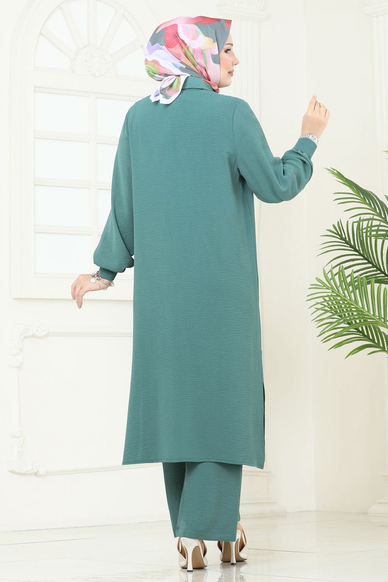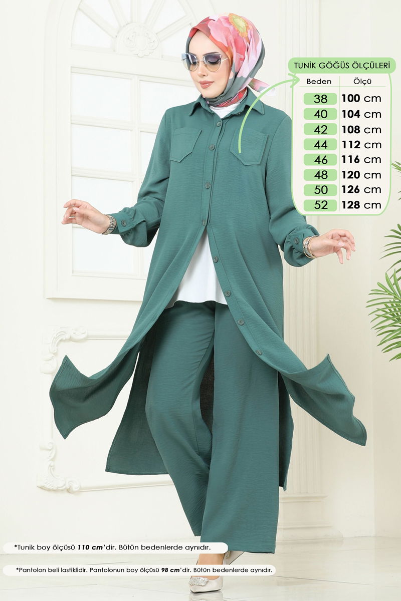 The Pocket Detailed Aerobin Set is a modest fashion piece suitable for all seasons. It can be washed at 30 degrees with gentle care. Made from aerobin fabric, it features a shirt collar and front buttons, making it stylish and functional. The tunic is side-slit and unlined for comfort, while the pants have an elastic waist for ease of wear. The breast pocket is functional and the cuffs feature buttons for added detail.