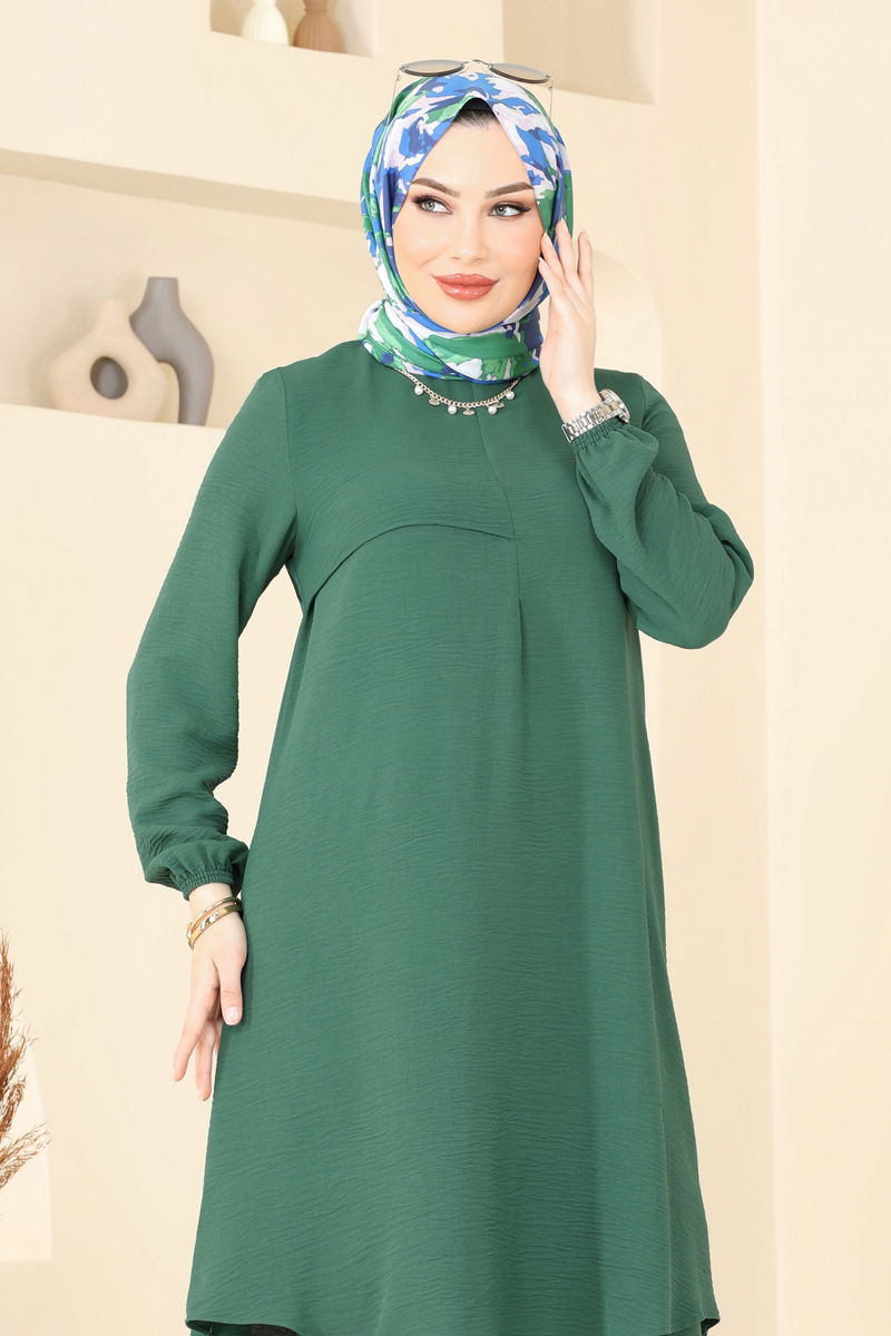 The Elastic Cuffed Aerobin Set, with its model, brings a modern twist to modest fashion. Suitable for all seasons, this product offers delicate wash at 30 degrees. The lightweight and breathable Aerobin fabric ensures comfort throughout the day. Its bicycling neck and slit on the side of the tunic complete your elegance with a button detail that can be used from the back. The elastic waistband on the pants and the elastic cuffs on both the tunic and pants provide flexibility and ease of use. The product displayed on the model is size 38.