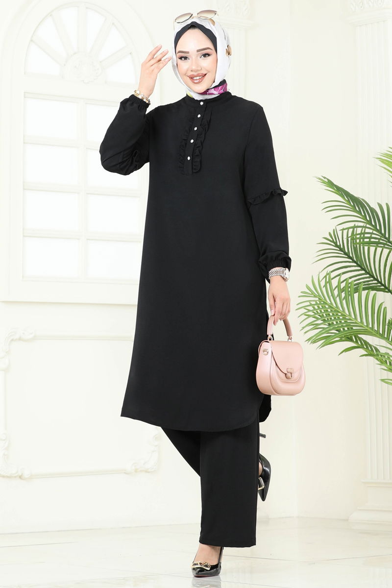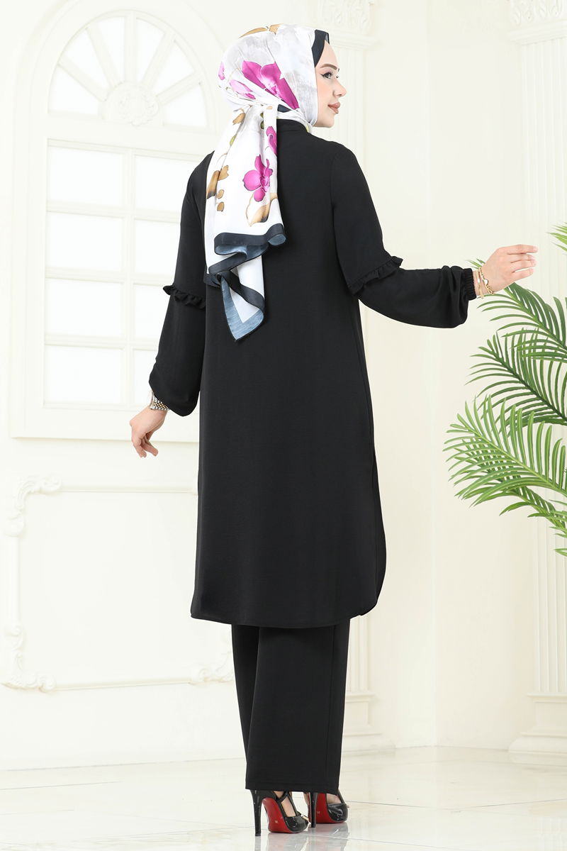 Product Feature : It is a new season hijab fashion product. The product has a Half Judge collar. The product has half front buttons. The tunic has a side slash.. Unlined. Details are sewn. The waist of the trousers is elastic. The cuff is rubberized. There may be a tonal difference in the product due to concept photo shoots.