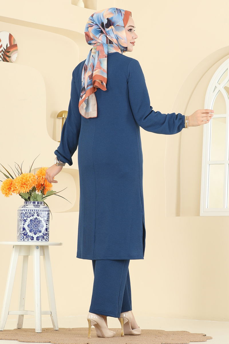 The Bicycle Neck Ribbed Suit is a modern hijab fashion item that can be comfortably used in all four seasons. Offering comfort with its special ribbed fabric, it also combines elegance with a bicycle neck and slit detail on the side of the tunic. This suit, which can be washed for practical use, can be cleaned at 30 degrees in a gentle wash mode. The product is unlined and the sample on the model is size 38. The trousers have an elastic waist and the elastic cuffs on both the tunic and trousers promise comfortable wear all day.