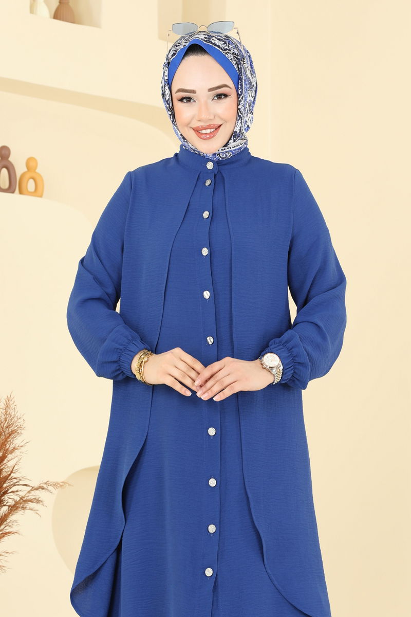 The Front Buttoned Aerobin Set merges innovative design with comfort, offering a versatile Islamic clothing option suitable for all seasons. Made from aerobin fabric that requires gentle washing at 30 degrees, this set features a demure stand-up collar and front button design that emphasizes elegance. The unlined structure ensures lightness while the elastic cuffs and waistband provide comfort. The blouse is not included and is used only for styling purposes. This outfit fits all standard sizes with its precise measurements.