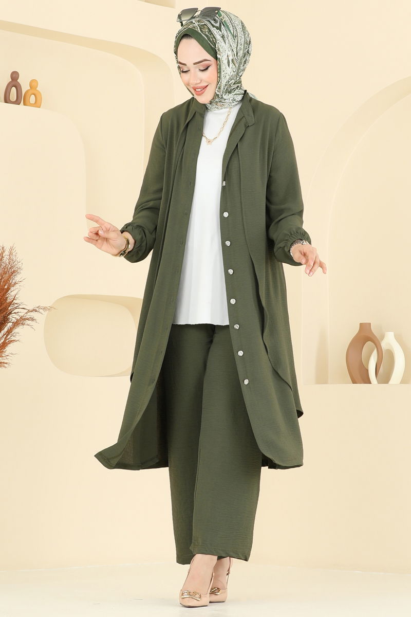 The Front Buttoned Aerobin Set merges innovative design with comfort, offering a versatile Islamic clothing option suitable for all seasons. Made from aerobin fabric that requires gentle washing at 30 degrees, this set features a demure stand-up collar and front button design that emphasizes elegance. The unlined structure ensures lightness while the elastic cuffs and waistband provide comfort. The blouse is not included and is used only for styling purposes. This outfit fits all standard sizes with its precise measurements.