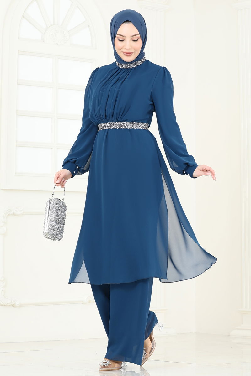 Product Feature : It is a new season hijab fashion product. The product has a Judge collar. The tunic has a side slash.. It is lined. The product has a zipper at the from the back part. The stones are glued. Belt included, optional not available. The waist of the trousers is elastic. Cuff buttons are active. There may be a tonal difference in the product due to concept photo shoots.