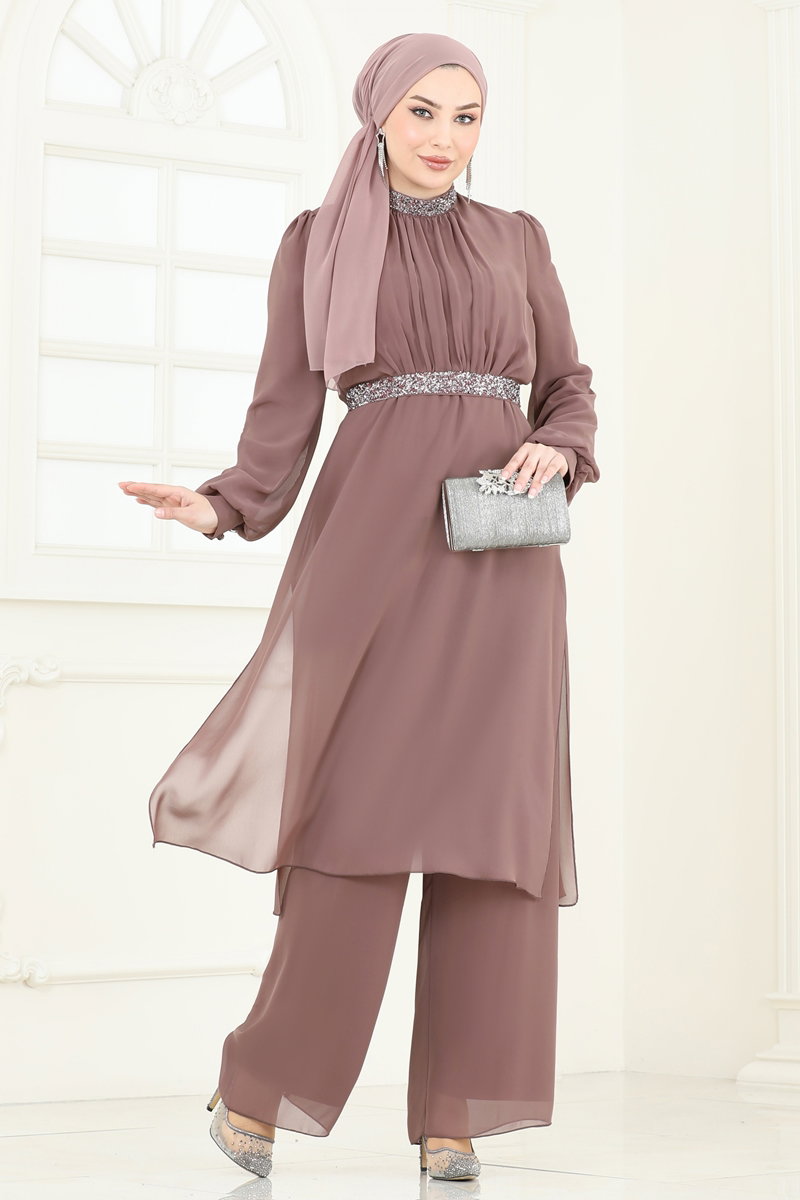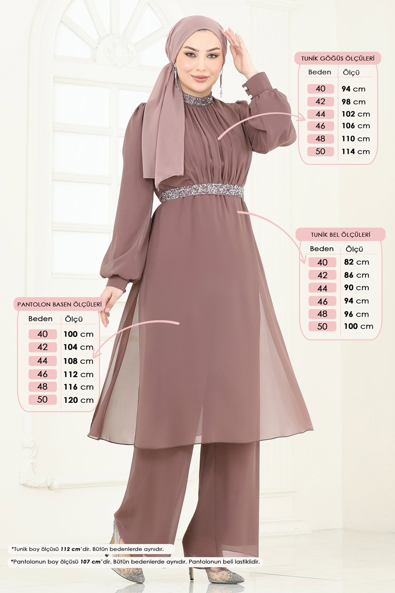 Product Feature : It is a new season hijab fashion product. The product has a Judge collar. The tunic has a side slash.. It is lined. The product has a zipper at the from the back part. The stones are glued. Belt included, optional not available. The waist of the trousers is elastic. Cuff buttons are active. There may be a tonal difference in the product due to concept photo shoots.