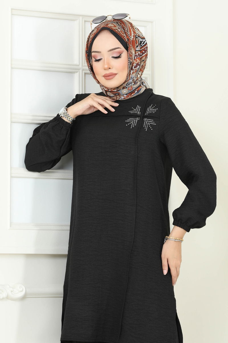 يتم ارتداء المنتج على الرأس. يوجد زر يمكن استخدامه من الخلف. المنتج لديه ياقة دائرية. البلوز تحتوي على فتحة. غير مبطنة. يتم لصق الحجارة. خصر البنطال مرن. السوار مطاطي. قد يكون هناك اختلاف في الدرجة اللونية في المنتج بسبب التقاط الصور الفوتوغرافية.