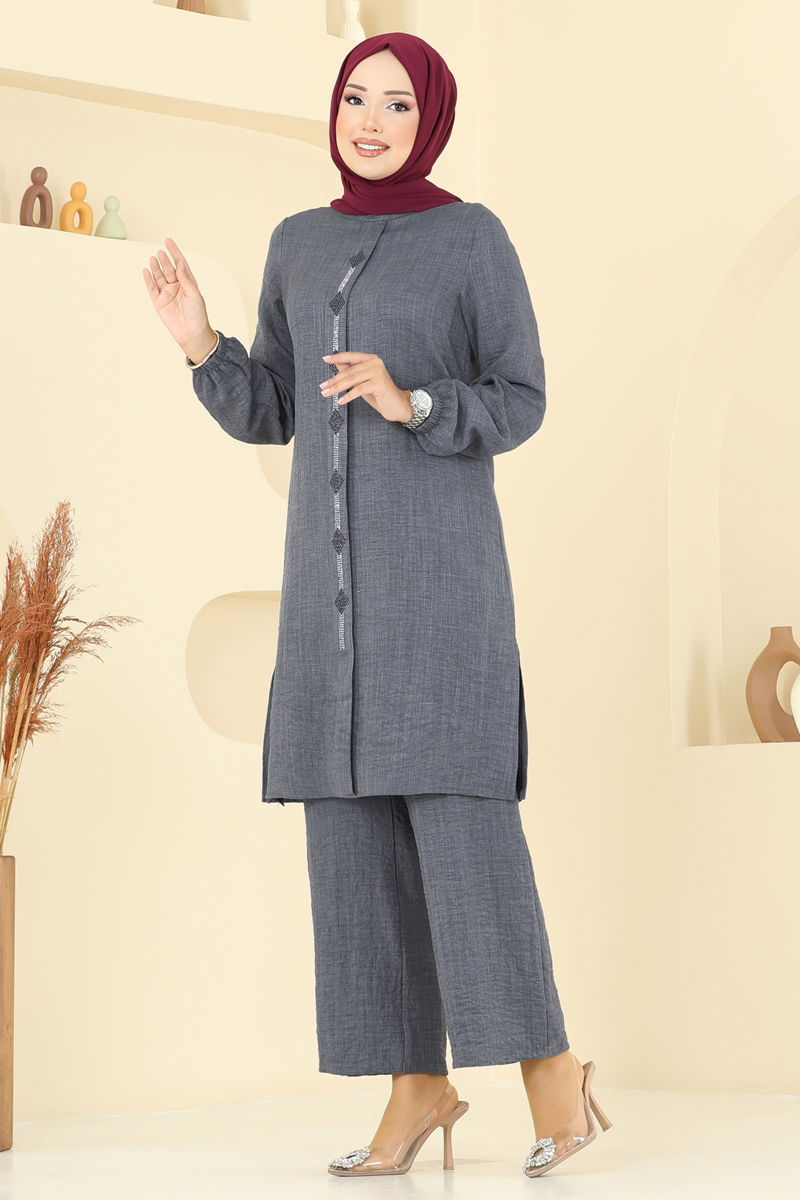 يوجد زر يمكن استخدامه من الخلف. المنتج لديه ياقة دائرية. البلوز تحتوي على فتحة. غير مبطنة. يتم لصق الحجارة. خصر البنطال مرن. السوار مطاطي. قد يكون هناك اختلاف في الدرجة اللونية في المنتج بسبب التقاط الصور الفوتوغرافية.