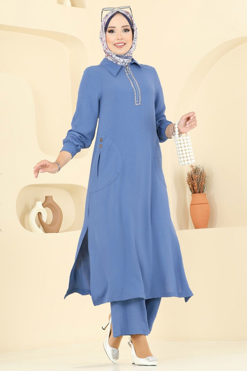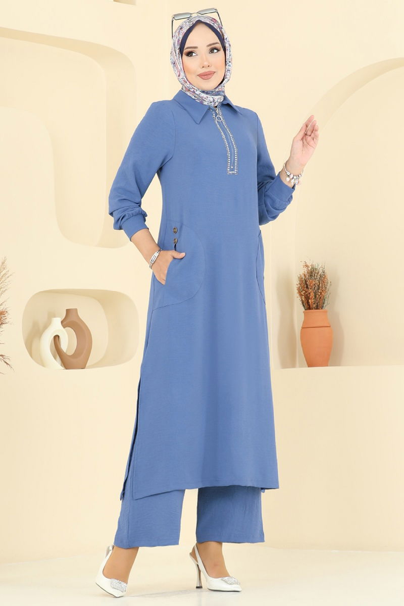 يوجد سحاب نصفي يمكن استخدامه من الأمام. المنتج لديه ياقة القميص. البلوز تحتوي على فتحة. يتم لصق الحجارة. خصر البنطال مرن. قد يكون هناك اختلاف في الدرجة اللونية في المنتج بسبب التقاط الصور الفوتوغرافية.