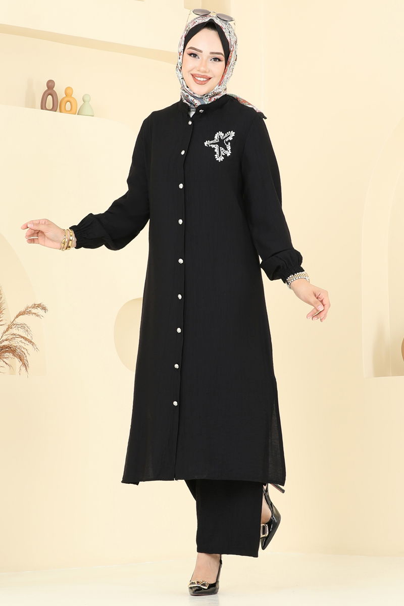 Product Feature : It is a new season hijab fashion product. The product has a Half Judge collar. The product has From the front buttons. The tunic has a side slash.. Unlined. The stones are glued. The waist of the trousers is elastic. The cuff is rubberized. There may be a tonal difference in the product due to concept photo shoots.