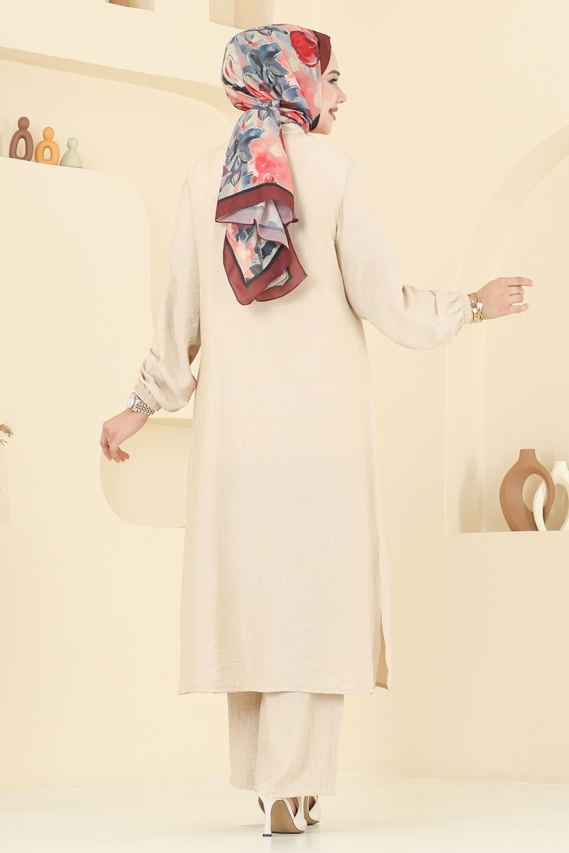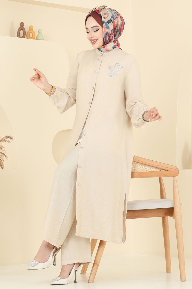 المنتج لديه ياقة نصف بيضوية. المنتج به أزرار من الأمام. البلوز تحتوي على فتحة. غير مبطنة. يتم لصق الحجارة. خصر البنطال مرن. السوار مطاطي. قد يكون هناك اختلاف في الدرجة اللونية في المنتج بسبب التقاط الصور الفوتوغرافية.