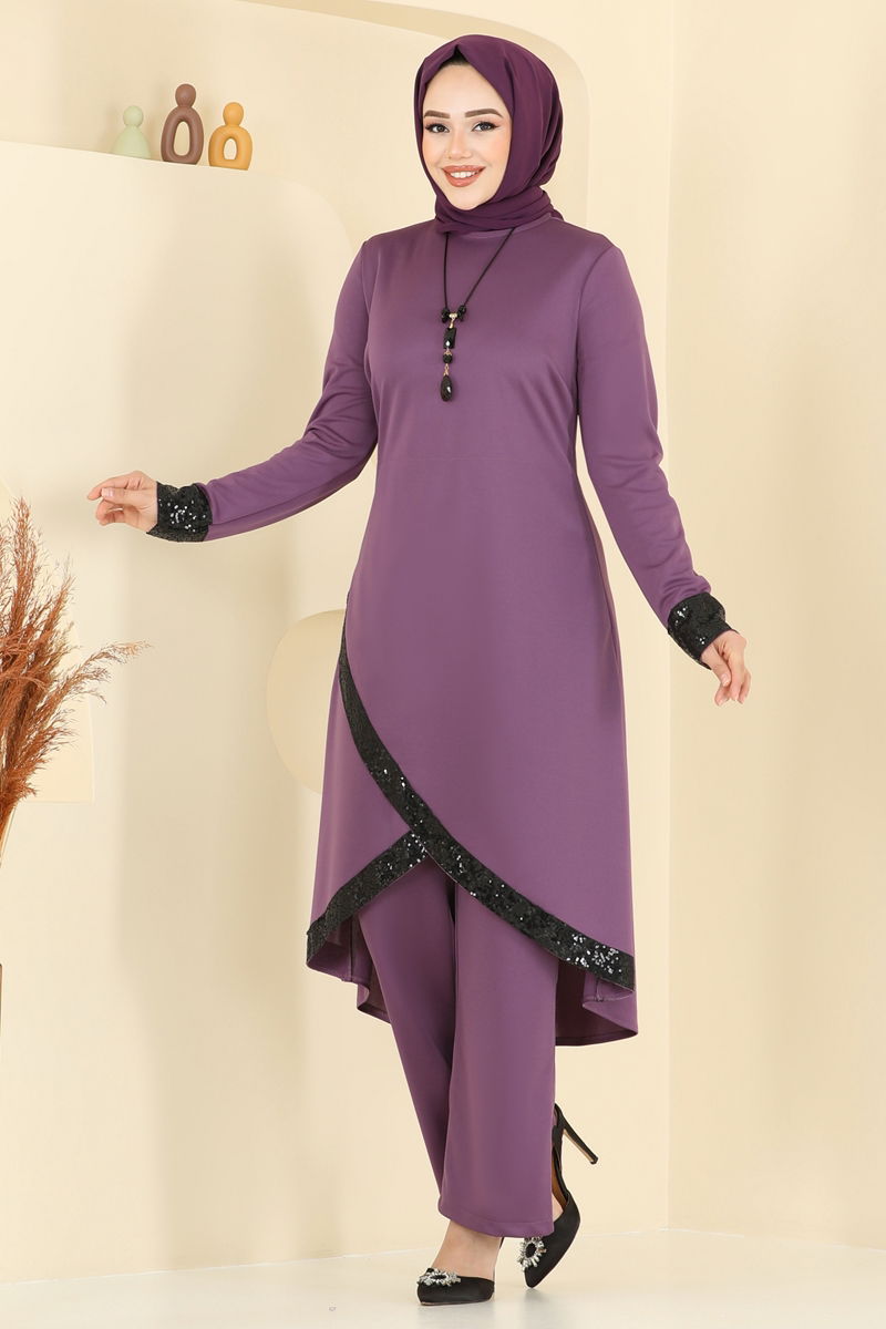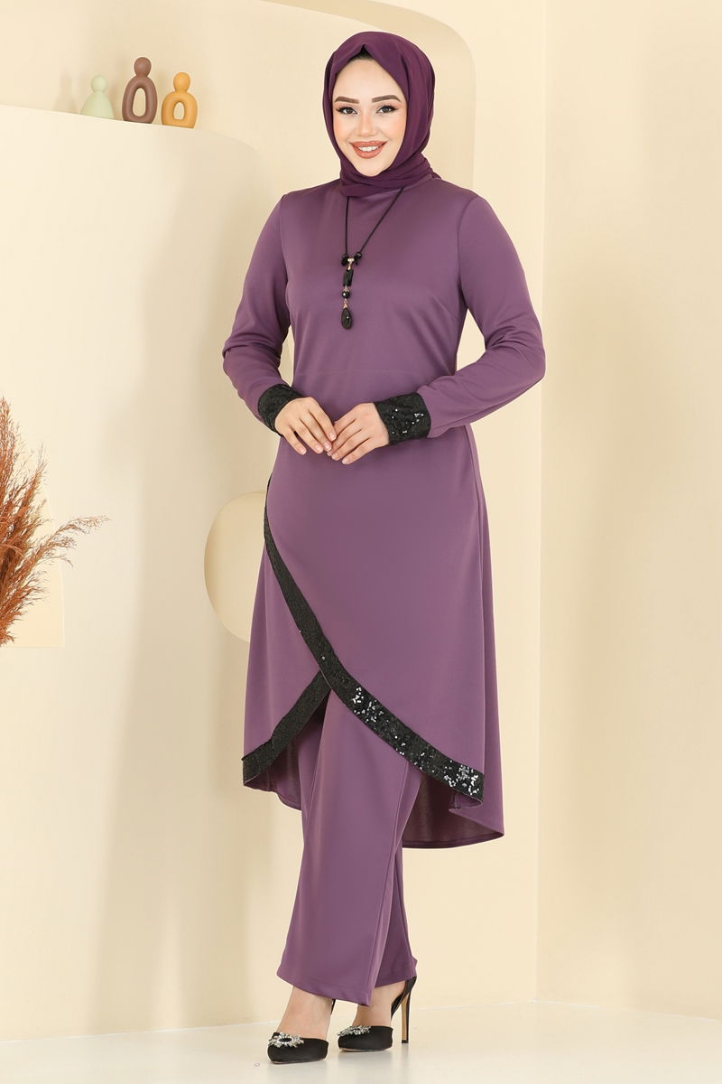 المنتج لديه ياقة دائرية. غير مبطنة. المنتج به سحاب في جزء من الخلف. تفاصيل الترتر اللامع تم خياطته المنتج يحتوي على حزام خصر مُخاط. القلادة متضمنة واختيارية يمكن استخدامها حسب الرغبة خصر البنطال مرن. قد يكون هناك اختلاف في الدرجة اللونية في المنتج بسبب التقاط الصور الفوتوغرافية.