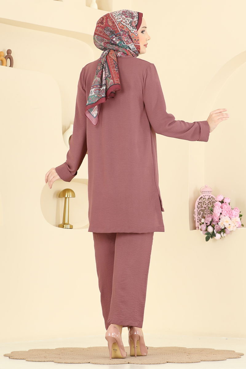 Offering both elegance and comfort, the Salaş Long Double Set COMBINATION is an ideal modest wear suitable for all seasons. This set, which can be washed gently at 30 degrees, is made from light and breathable aerobin fabric. The bicycle neck tunic features side slit, while the elastic waistband on the pants increases comfort. The stitched fold detail on the sleeve cuffs completes the elegance, making this duo a perfect addition for both daily wear and special occasions.