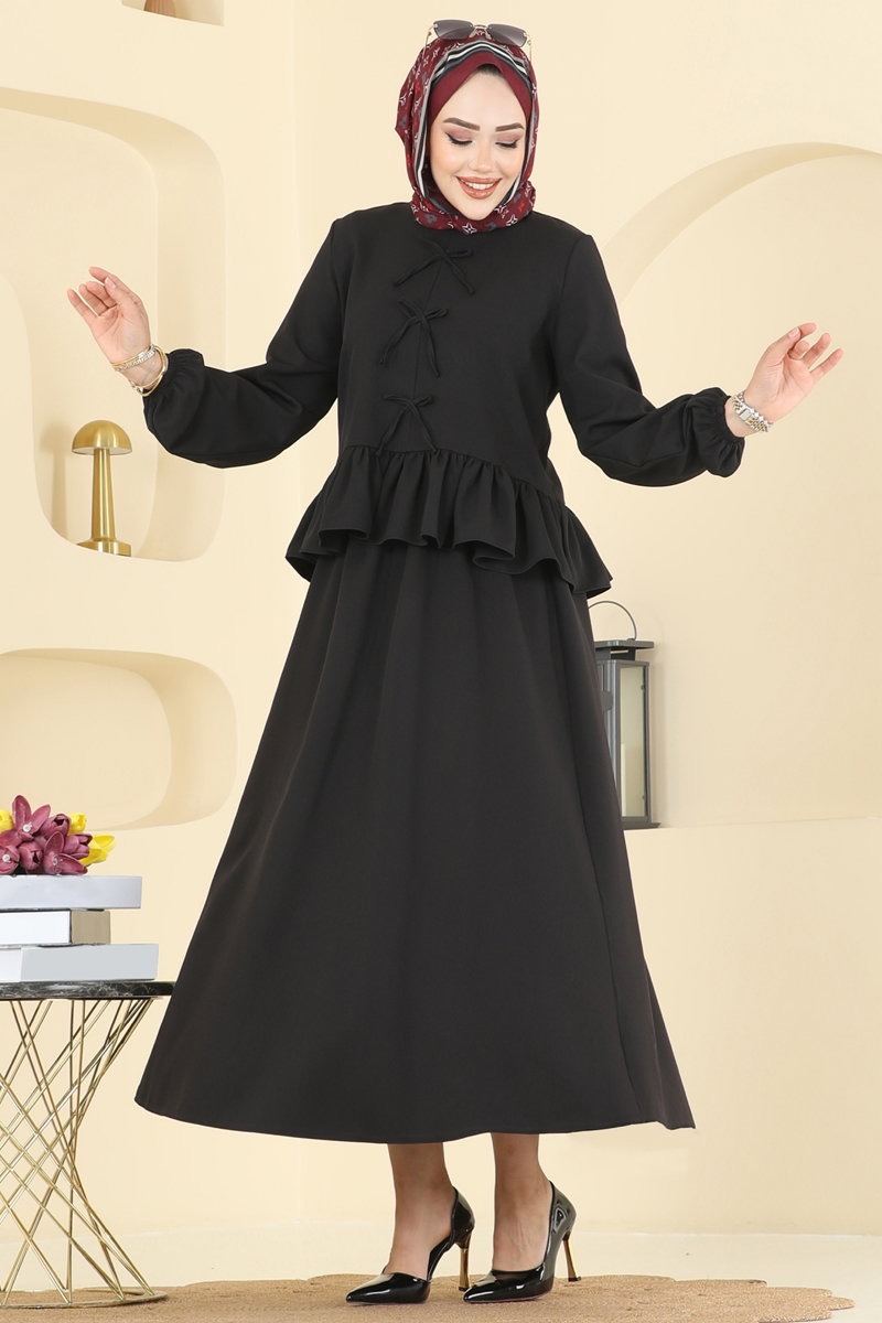 The Bow Detail Two Piece Suit is a hijab outfit suitable for all seasons. It can be washed at 30 degrees without wringing (delicate wash). Made from durable Dabil fabric, this set includes a bicycle-neck top and is unlined. The piece in the model is size 40 and features a button at the back for easy wearing. The waist of the skirt is elasticized, and both the blouse and the skirt have elasticized cuffs.