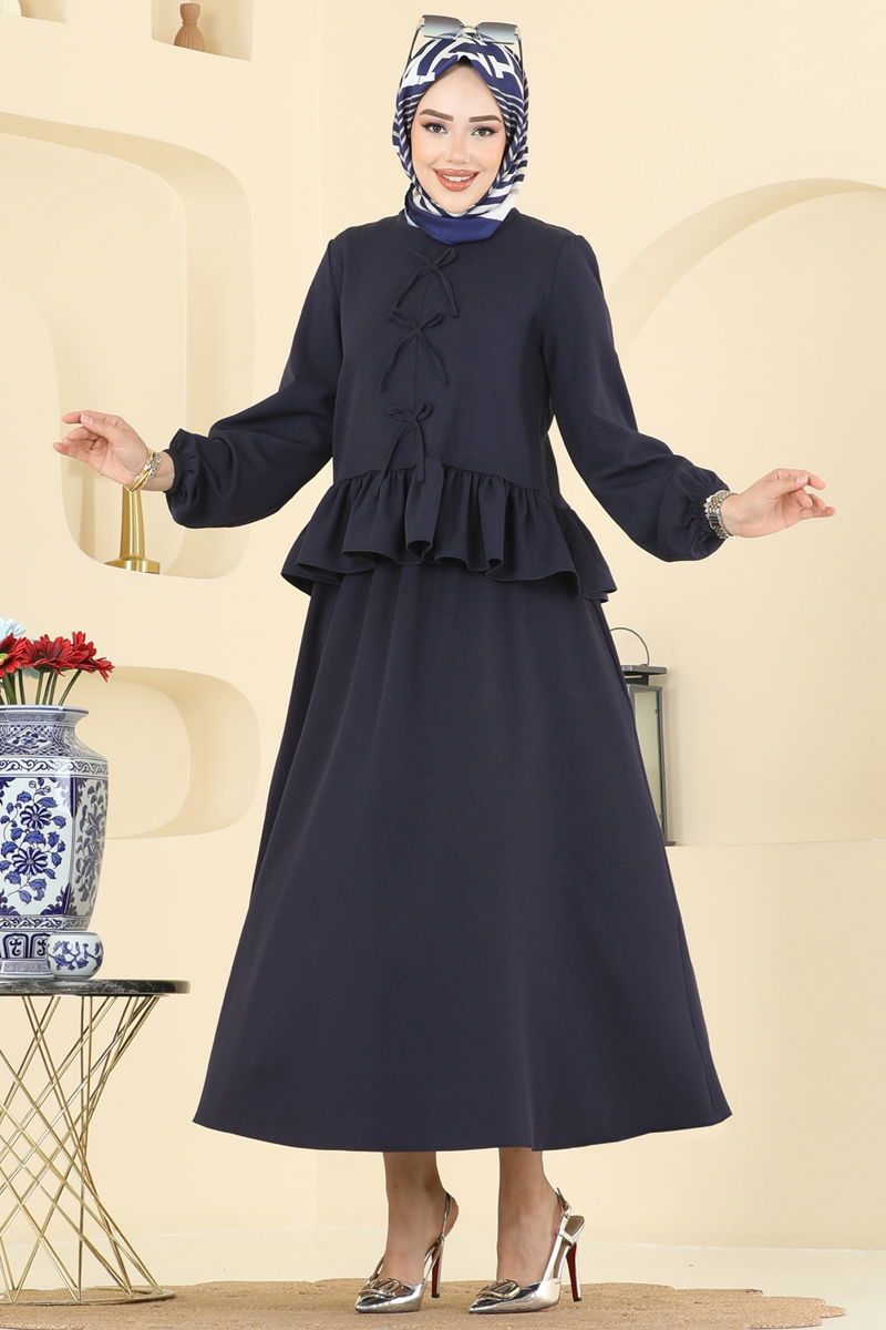 The Bow Detail Two Piece Suit is a hijab outfit suitable for all seasons. It can be washed at 30 degrees without wringing (delicate wash). Made from durable Dabil fabric, this set includes a bicycle-neck top and is unlined. The piece in the model is size 40 and features a button at the back for easy wearing. The waist of the skirt is elasticized, and both the blouse and the skirt have elasticized cuffs.