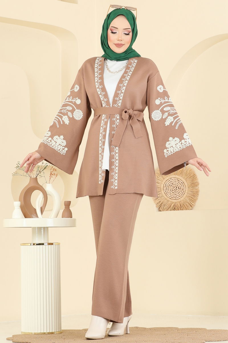 المنتج لديه ياقة السترة. غير مبطنة.. يتم خياطة تفاصيل التطريز. الحزام متضمن، ،يمكن استخدامها حسب الرغبة خصر البنطال مرن. قد يكون هناك اختلاف في الدرجة اللونية في المنتج بسبب التقاط الصور الفوتوغرافية.