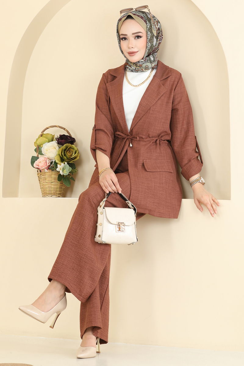 The Apolet Detailed Sofia Suit KOMBİN model is a stylish and functional modest wear. Made from linen, this suit can be comfortably worn in all seasons. The jacket is unlined for comfort, while the pants have an elastic waist for added convenience. The pocket detail on both the jacket and pants adds a touch of elegance, while the active shoulder strap buttons on the cuffs are chic. The product can be washed gently at 30 degrees.