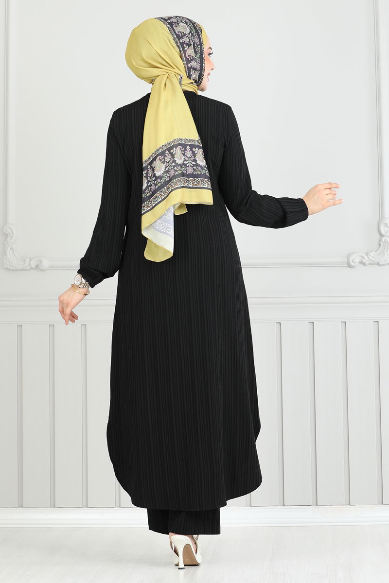 Product Name: Hidden Button Twin Set. This model is a modest wear suit, which can comfortably be used in all four seasons. It can be washed in a gentle cycle at 30 degrees Celsius. Made from tree bark fabric, it is durable and comfortable. The bicycle neck and hidden button design offer a modern and stylish look. The tunic has side slits and is unlined, while the pants have an elastic waist for added comfort. The product displayed is in size 38. It allows you to maintain your elegance in any season.