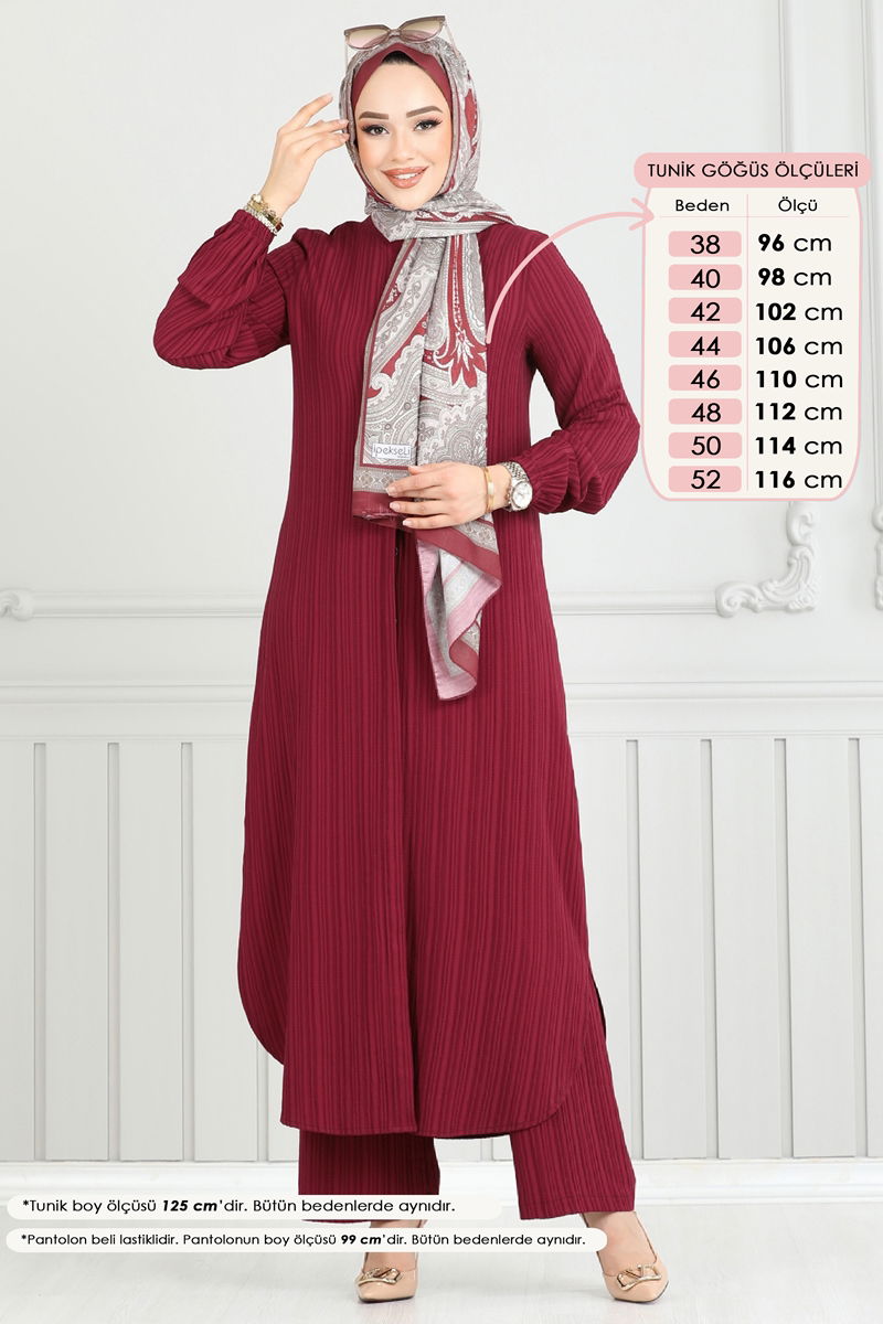 Product Name: Hidden Button Twin Set. This model is a modest wear suit, which can comfortably be used in all four seasons. It can be washed in a gentle cycle at 30 degrees Celsius. Made from tree bark fabric, it is durable and comfortable. The bicycle neck and hidden button design offer a modern and stylish look. The tunic has side slits and is unlined, while the pants have an elastic waist for added comfort. The product displayed is in size 38. It allows you to maintain your elegance in any season.